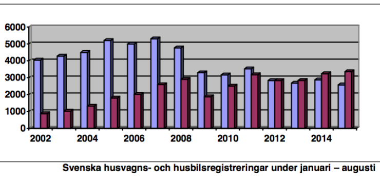 Under augusti månad 2015 registrerades 203 husvagnar. (Motsvarande månad året dessförinnan registrerades 255 stycken.) Hittills under 2015 betyder det 2 576 registrerade husvagnar mot 2 877 under samma period 2014. I procent innebär detta en minskning med 10,46 %.