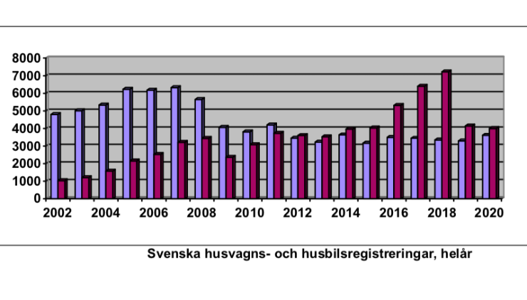 Börjar vi med att titta på den sammantagna nybilsförsäljningen, alltså både till företag och privatpersoner, är 2020 års minskning jämfört med 2019 18 procent. Vi brukar jämföra försäljningen med enbart privatmarknaden eftersom husbilar nästan uteslutande är privatägda och där var minskningen 15 procent. I ljuset av det framstår minskningen för husbilar som måttlig, siffrorna varierar mellan en och 3,5 procent. I andra länder, inte minst den viktiga tyska marknaden, har det däremot slagits rekord, något som sannolikt hade varit fallet även i Sverige om inte den kraftiga ökningen av skatten på husbilar hade införts.