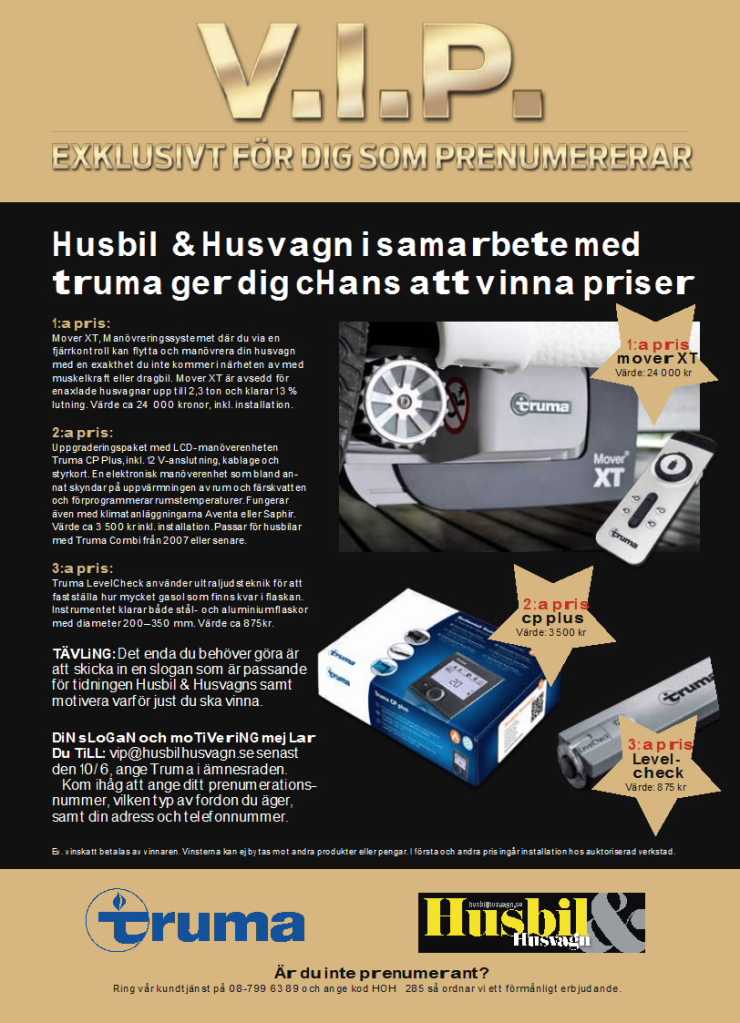 I det här numret av Husbil & Husvagn har vi en tävling exklusivt för prenumeranter. Det du behöver göra för att ha chans att vinna är att skicka in en slogan som är passande för tidningen Husbil & Husvagn samt motivera varför just du ska vinna.