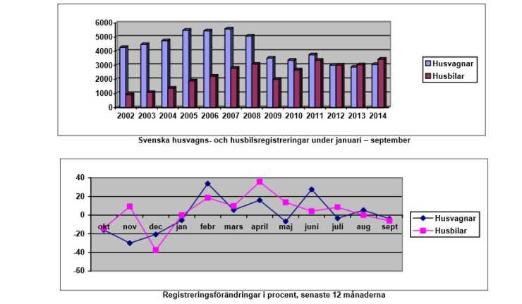 Under september månad 2014 registrerades 197 husvagnar. Motsvarande månad året dessförinnan registrerades 205 stycken. Hittills under 2014 betyder det 3074 registrerade husvagnar mot 2884 under samma period 2013. I procent innebär detta en ackumulerad ökning på 6,84 procent även om månaden är svagt nedåt.