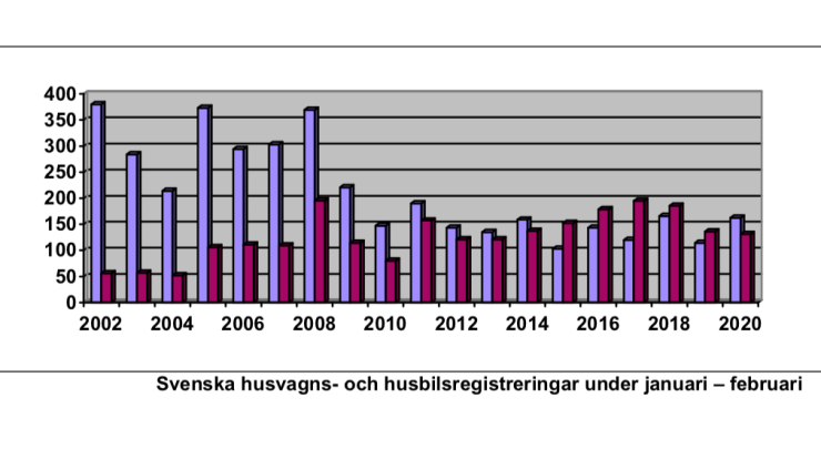 Trafikanalys (SCB) anger att det under februari 2020 registrerats 22 489 personbilar vilket är en minskning med 5,5 procent jämfört med februari föregående år. Det bör sättas i sammanhang med en högre inregistreringstakt i december 2019 eftersom skatten höjdes för en rad fordon vid årsskiftet vilket gjorde att bilhandlarna ställde på sina lagerfordon för att undvika höjningen. På grund av detta blir statistiken inte jämförbar månad för månad och kan även ses som en delförklaring till att dieselbilar uppgick till måttliga 25,1 procent av nyregistreringarna, en minskning med 12,0 procent jämfört med februari föregående år. Trafikanalys anger antalet nyregistrerade husbilar under 2020 till 181 vilket är en ökning med 2,3 procent från föregående års 177.