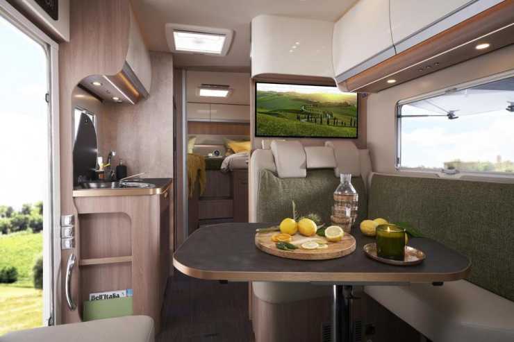 Vid soffgruppen ger även det stora fönstret ett bra ljusinsläpp. Ett stort kök samt ändringsbar sittgrupp ger sittplats för fem personer. Därutöver framhåller juryn att samspelet mellan förarplatsen och sittgruppen är föredömlig med kontinuerliga väggar och gemensam design.