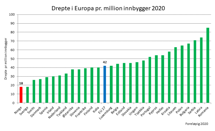 Norge, Sverige och Danmark leder trafiksäkerhetsligan om man jämför EU:s 27 medlemsländer. Norge och Sverige har med 18 omkomna per miljon invånare faktiskt inte ens hälften så många omkomna jämfört med EU:s snitt som dock minskat med 36 procent under den senaste tioårsperioden.