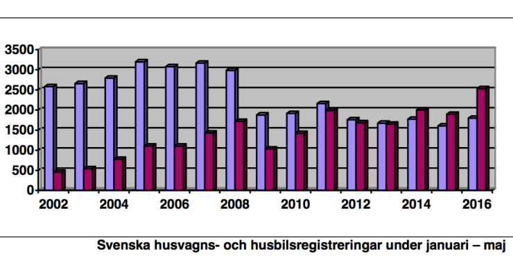 Maj månads husbilsregistreringar visar 900 stycken, medan det i maj föregående år registrerades 568 husbilar. Hittills under kalenderåret 2016 har det totalt registrerats 2 530 husbilar, medan det under motsvarande period 2015 registrerades 1 896 stycken. I procent innebär detta en rekordstor ökning med hela 33,44 % för år 2016.
