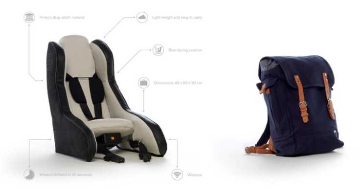 Den nyskapande lösningen, som fortfarande befinner sig på utvecklingsstadiet vid ett forskningscenter i USA, kan stuvas undan i en liten väska när den inte används. På så sätt kan bilbarnstolen enkelt flyttas mellan olika bilar. Väskan kan även tas med som handbagage på flyget.