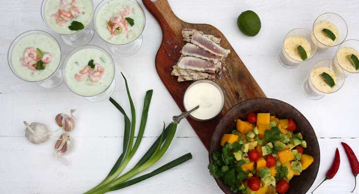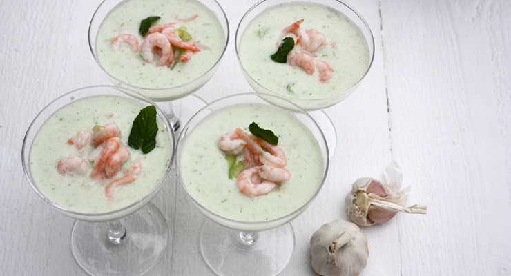 Kall mynta- och gurksoppa med räkor