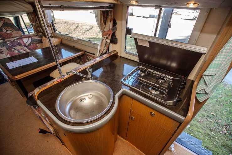 Köket är praktiskt inrett, gasolspis med tre lågor och en rund diskho i vinkeln ut mot mittgången. Under diskhon finns ett praktiskt skåp med nedersta hyllan inrett för flaskor. Över diskbänken ett skåp med jalusi och i övrigt gott om förvaring i köksdelen. Över spisen finns ett fönster som släpper in arbetsljus och ugnen sitter högt placerad över kylskåpet. I det här fallet är ugnen helt oanvänd, kanske för att placeringen inte är så praktisk?