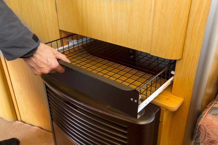 Värmen sköts av en Trumatic, centralt placerad mellan köket och långsoffan. En fiffig detalj är den trådkorg som placerats ovanför, perfekt för att torka fuktiga vantar och mössor.