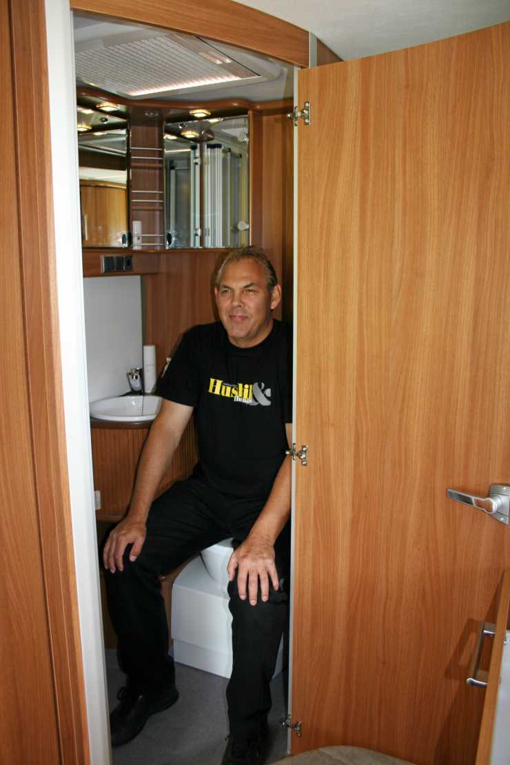 Dags för ett besök i toalett- och tvättrummet. Även här finns det mysbelysning samt många förvaringsutrymmen, men ingen 230-voltuttag vilket jag saknar. Vidare är själva toalettsitsen ganska skön att sitta på och porslinssitsen gör att man nästan känner sig som hemma. Det är däremot trångt bakom stolen och är man större än vad jag är, kan det vara svårt att komma åt efter uträttat behov. Det som däremot överraskar positivt är duschutrymmet. Innanför duschväggarna mäter det ca 65x65 cm och det känns rymligt. Riktigt plastgolv säkerställer också att man slipper oroa sig för fuktskador på sikt. Toalettskåpen har spegeldörrar och allt känns gediget inne på toaletten. Ett fönster hade dock höjt betyget.