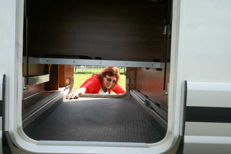 För att komma åt förvaringsutrymmena lyfter man helt enkelt sängarna uppåt. De behöver inte fästas för att stanna i uppfällt läge. I min smak är det inte tillräckligt med förvaring, men som tur är finns bilen även som garagemodell. Föredrar man mer lastutrymme väljer man en sån. Bra dock är att det går att stuva från två olika håll.
