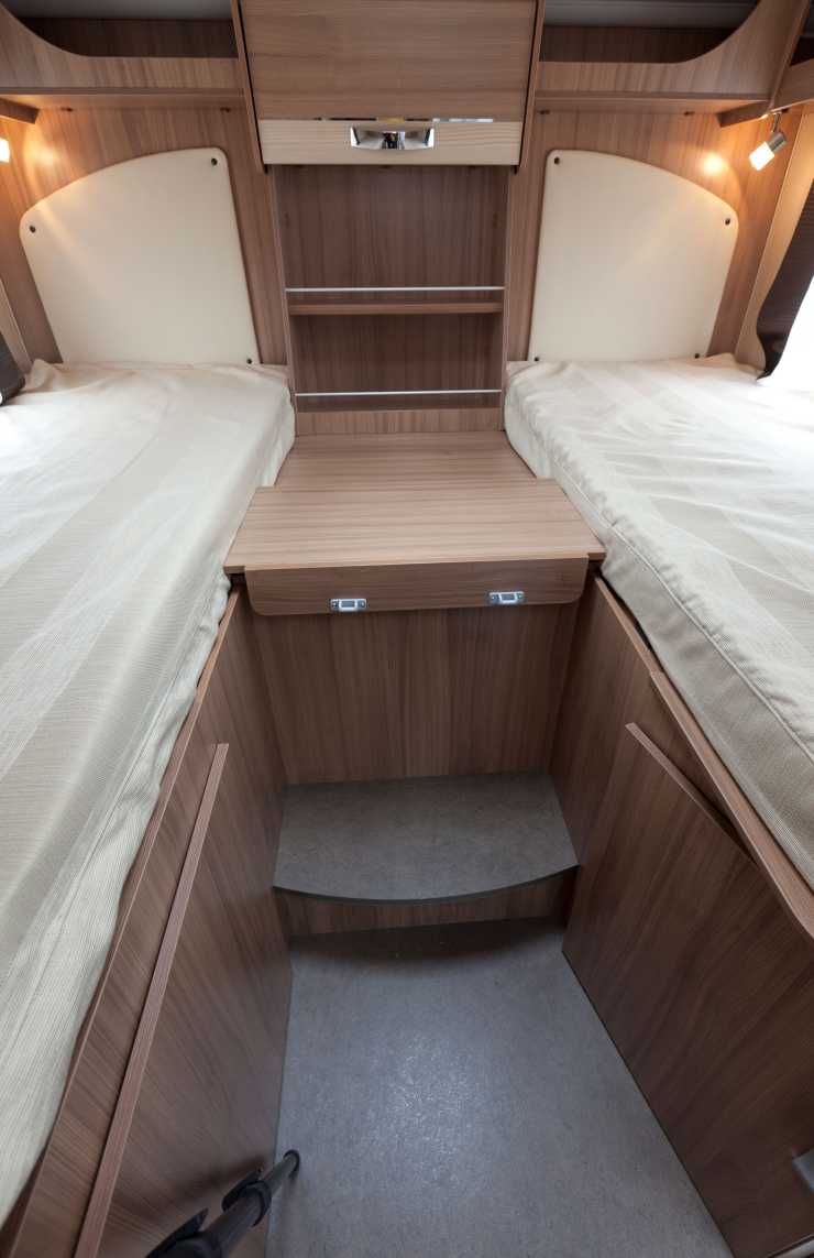 Sovdelen domineras av de två högt placerade långbäddarna. Båda är 78 centimeter breda. Den ena sängen är 197 centimeter lång och den andra 184 centimeter. Möjlighet att bädda ihop sängarna till en jättesäng finns. En utvikningsbar sängbotten finns mellan sängarna. I hopfällt läge utgör den ett slags bord mellan långbäddarna. Ingen dum lösning. Under sängarna finns två garderober med varsin klädstång. På tillvalslistan finns en klädstång som går att dra ut. Det kanske skulle vara en bra idé att ha det som standard. Sängbottnarna går nämligen inte att lyfta. Med andra ord får man gå ned på knä då en skjorta ska hängas in eller tas ut. Förvaringen i övrigt består av både överskåp och öppna hyllor. Mellan bäddarna finns en gigantisk öppen hylla placerad mot bakstammen. Två hyllplan finns. Återigen undrar vi vad som ska förvaras i ett så pass stort öppet utrymme? Förflyttar vi oss fram i bilen igen möts vi av en sittgrupp med plats för fem personer. L-soffan har en fin finess som torde brukas flitigt av de som har en sådan här bil. Det går nämligen att med ett enkelt handgrepp fälla ned den främsta delen. Den delen är i vägen när soffan ska tjänstgöra som färdplatser, så då är det naturligt att fälla ned soffstumpen. Vi tycker att soffgruppen funkar bättre med den nedfälld hela tiden. Stumpen är nämligen så obekväm i jämförelse med övriga sittplatser att den känns onödig. Klädseln heter Macadamia och går i brunt och beige. Bordet går att skjuta i längs- och sidled men ingen förlängningsskiva finns. Vilket behövs ifall alla sittplatser används. I taket finns en stor taklucka som ger välkommet ljus. Det enda som saknas är lite mer belysning, kanske infällda i takluckans karm? Tv-apparaten finns i ett överskåp mellan köket och sittgruppen. I skåpet finns antennsladd och kontakt. En bra lösning. Förarplatsen känns lite dyster då all inredning är i svart plast. Men alla funktioner finns även om vi inte hittar någon bra kaffemuggshållare. Stolarna är av märket Aguti och de är lite krångliga att vända, det är inte unikt för bilen utan det brukar Agutistolar vara. Fördelen med dem är att de är bekväma att sitta i, vilket får anses vara viktigt i sammanhanget. Sköna stolar som är lätta att snurra vore ju det idealiska.