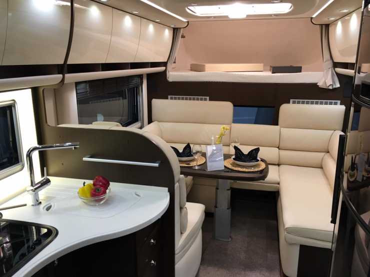 De ljusa ytorna ger en luftig känsla i sittgruppen som är mer än en U-soffa. Nästan en O-soffa rentav! En sektion av soffan in mot hytten kan tas bort för passage.