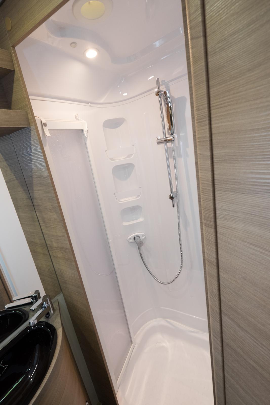 Låga långbäddar med hygienutrymmet längst bak i bilen. Notera de öppna hyllorna längst bort i överskåpen. Bra till böcker när man står stilla.