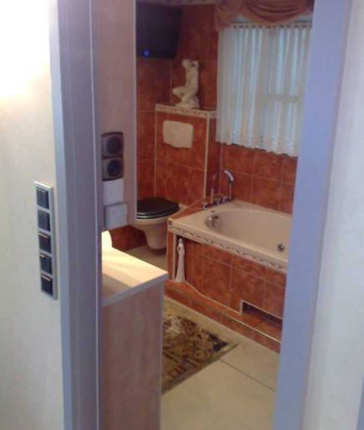 Helkaklat badrum med bubbelkar, statyetter och en riktig porslinstoalett. Notera raden med lysknappar utanför.