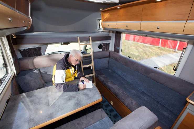 Till sängalkoven kommer man via en riktig bra trappstege och väl där, finns ljusinsläpp på vardera sidan om alkoven. På tal om ljusinsläpp, Solifern har stora fönster på båda sidor av dinetten och ett mindre över köksbänken. Med andra ord är det en ljus och trevlig bil vi provkör och livet ombord kan bli hur mysigt som helst. Sofforna på bägge sidor om bordet har nämligen ”myshörnor”, i vardera änden.