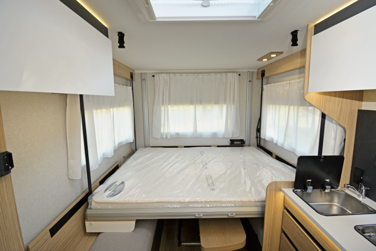 Ovanför u-soffan finns en rejäl dubbelsäng som sänks ner elektriskt.