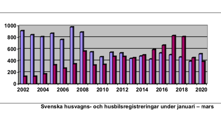 Mars månads husbilsregistreringar visar 254 stycken, medan det i mars föregående år registrerades 314 husbilar. Hittills under kalenderåret 2020 har det totalt registrerats 385 husbilar, medan det under motsvarande period 2019 registrerades 450 stycken. I procent innebär detta en minskning med 14,44 för år 2020.