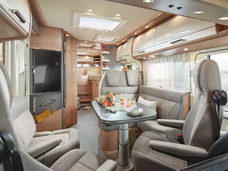 Sittgruppen består av en L-soffa och vändbara framstolar samt en liten hurts för fötter eller gäster. Vid entrén finns en rejäl 32-tums tv. Den ryms där tack vare att den i viloläget vrids 90 grader. Väljer man den helintegrerade modellen får man en gästsäng ovanför förarhytten som standard.