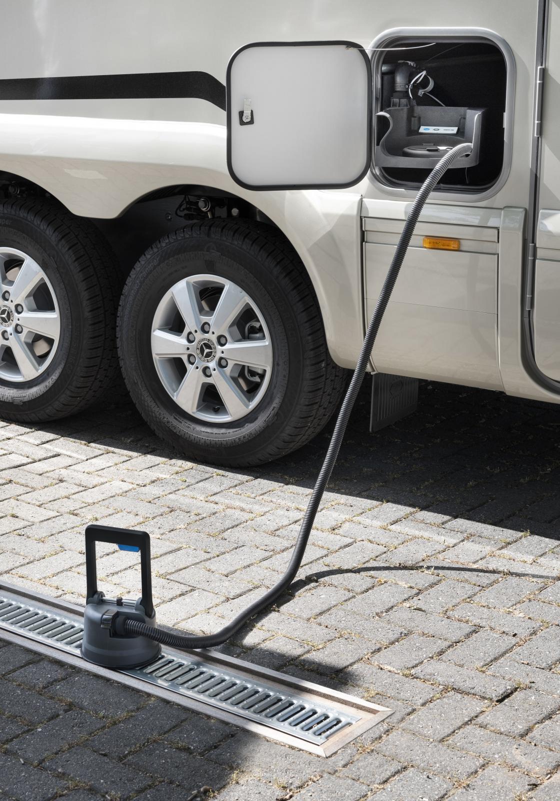 – Bara för att jämföra, hemma använder vi 3-10 liter per spolning. Och genom att återanvända gråvatten för spolning så sparas det cirka 112 liter färskvatten under en period av fyra veckor, och därmed också samma andel av avfallsvatten, skriver Van Noesel. Eftersom slangpaketet är kompakt och enkelt att installera, kan toaletten sättas fristående. Toaletten kan fixeras mot en vägg när du har en toalett med en konsol. Annars kan du placera toaletten varhelst du vill. Detta medför nya möjligheter av planlösningar för fordonstillverkaren. Då toaletten kan placeras fritt kommer man enkelt åt alla ytor och det är därmed enkelt att göra rent.