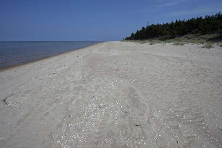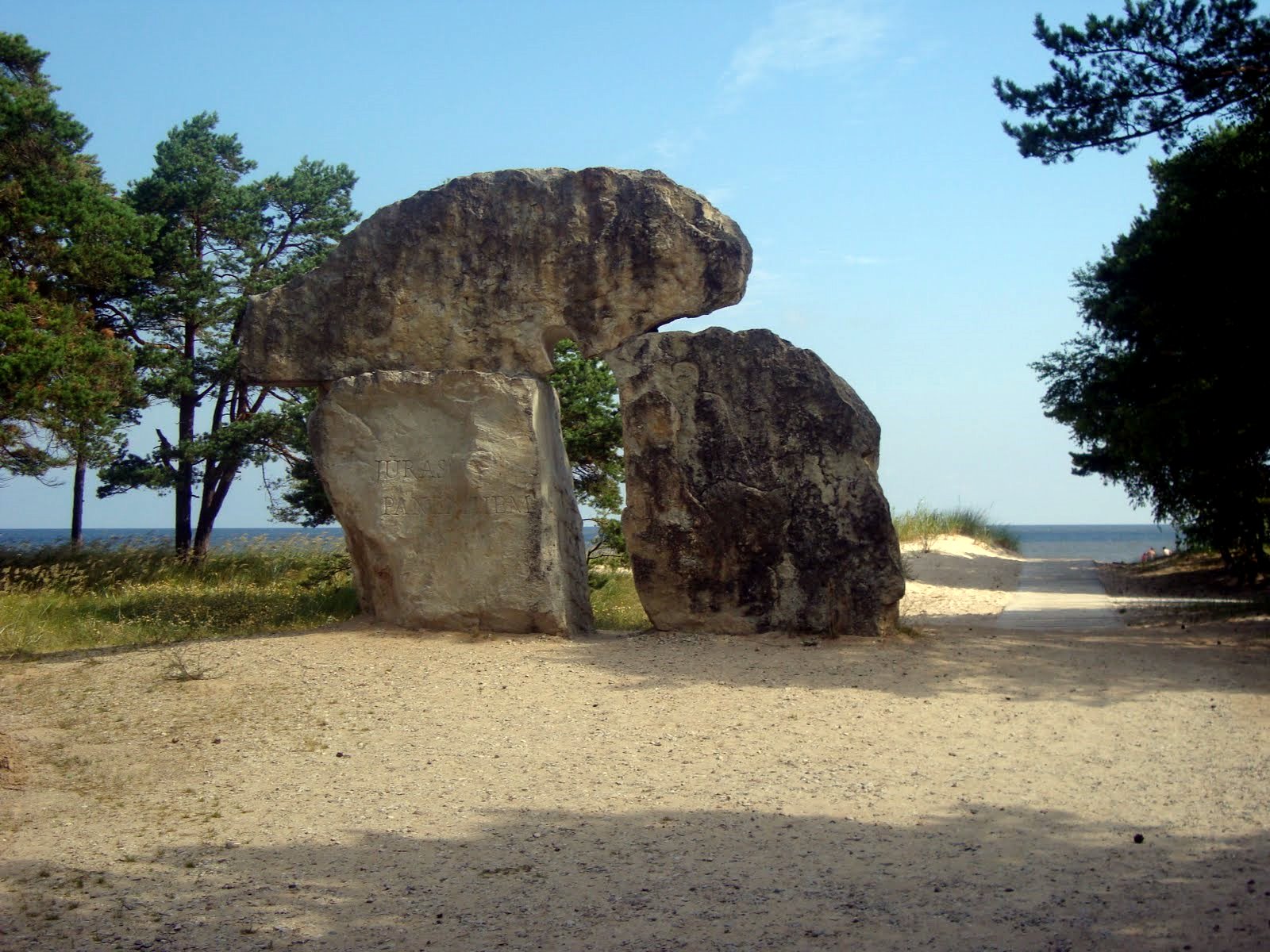 En liten parkering med ett litet café välkomnar dig i en karg natur. Här är det sand och krumma träd som dominerar och det blir den lilla gångvägen genom gången i en stor sten ut till stranden. Vi är ungefär 16 mil norr om Riga, längst ut på udden där Rigabuktens vatten möter Östersjön.