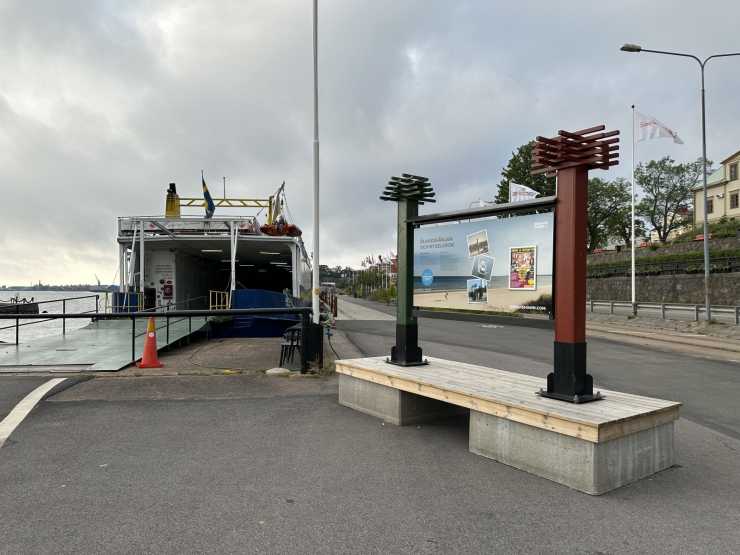 Det tar 20 minuter in till Oskarshamn från sjön. Vi kör in i stan från riksväg 47 och möts av en skylt som vill få oss att ta en omväg till färjan. Vi väljer att köra genom stan och kommer rakt på den lilla färjan. Den går inte att missa.