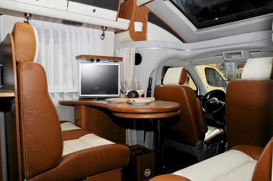 Längre fram finns ett vinkelkök och framför detta en hörnsoffa och en mindre sidosoffa på bilens högra sida i färdriktningen.