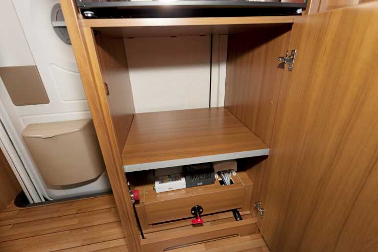 Under ”skohyllan” finns elcentralen något malplacerad, den stjäl ett lätt åtkomligt utrymme. Ovanför kylskåpet finns en lucka som döljer en utfällbar tv-arm. Den är ett tillbehör som känns givet. I utfällt läge hamnar tv:n mitt i vagnen och kan vridas mot antingen sittgruppen eller dubbelsängen bak. Praktiskt och smart!