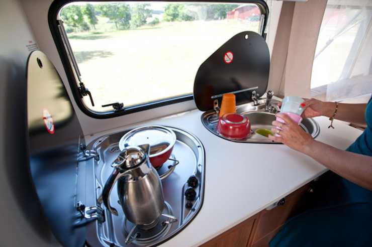 Ovan köksbänken finns halogenbelysning och ett fönster med en löst hängande jalusipersienn i aluminium. Däremot är testvagnen inte utrustad med köksfläkt.