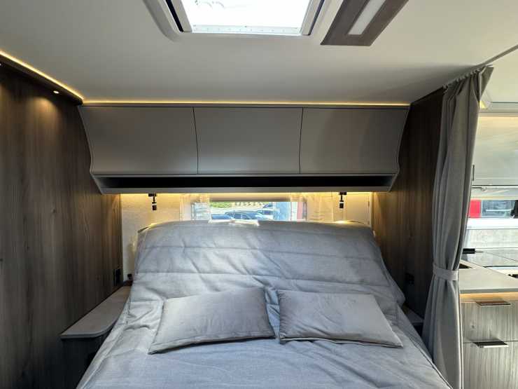 Att själva köksmodulen fått en upplyst distans vid golvet, så att fötterna går in därunder, är en liten men praktiskt nyhet. Det gör att man kan stå riktigt nära. Annat är rent ögongodis som de svarta handtagen. Två andra nyheter är den exklusiva blandaren – som redan finns i Imperial-husbilarna – och att Dometic-kylskåpet har bytts mot ett Thetford på 170 liter med 35-liters frysfack.