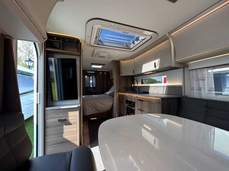 Ett steg längre in, i köket, finns fler nya detaljer. Några är av mer lyxig natur, som ”gas under glass”-spisen från Thetford, med induktionshäll som tillval. Den smälter in i bänkskivan, helt slät utan vred. Om det är bra eller inte är kanske en smaksak. Elegant är det i alla fall.