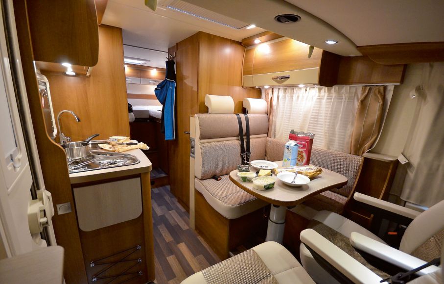 Provbilens kök är utrustat med ett 190-liters kylskåp från Thetford med separat frysfack. Detta är dock tillval, då standard är 108 liter. I övrigt är utrustningen typisk för klassen. Köksbänkens storlek är 58x94 centimeter, men den kan förlängas med en uppfällbar bordsskiva på 25x34 centimeter. Det finns tre lådor och överskåpet har en enda bred lucka. Sittgruppen rymmer fyra personer. Soffans dynor känns hårdare än vanligt och bredden är blygsamma 90 centimeter. Ovanför bodelsdörren finns Knaus välbekanta kontrollpanel, men kontrollenheten för Truma är ny. Den kräver lite tillvänjning men man känner sig snabbt hemmastadd. Hallen saknar garderob och det finns heller inte någon plats för en sådan. Knaus har dock löst skoförvaringen genom att placera en lättstädad plastlåda mellan passagerarstolen och väggen. Sikten vid färd är bra åt alla håll och tillvalsfönstret i bodelsdörren hjälper till vid trånga passager. Agutistolarna är bekväma och funktionella. Ljudisoleringen mot motorrummet kunde dock varit bättre. Speglarna är välplacerade, men den nedre vidvinkeldelen är inte elmanövrerad.